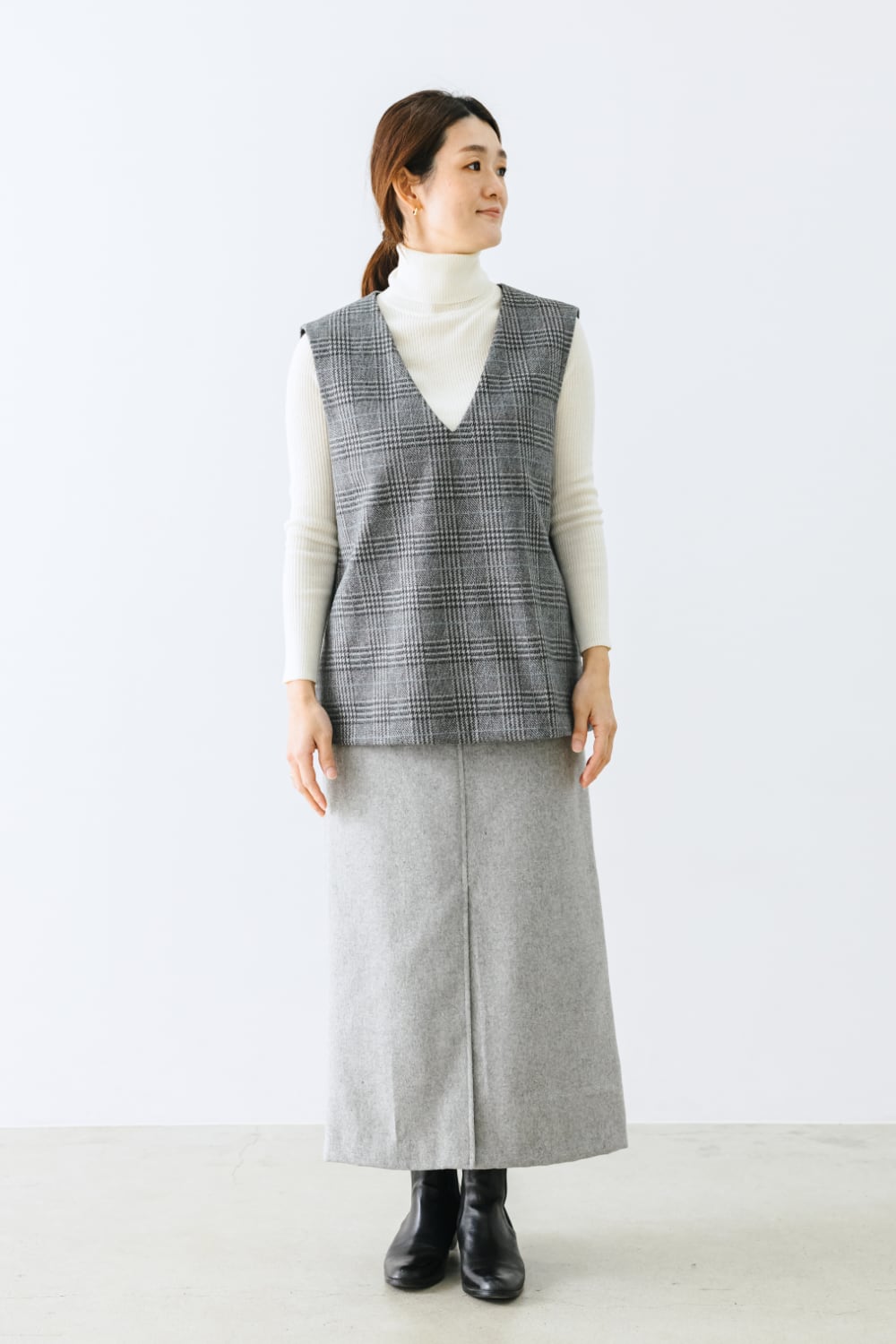 ほんのりすそ広がりのタイトシルエットで、体全体をすっきり縦ラインに見せます。